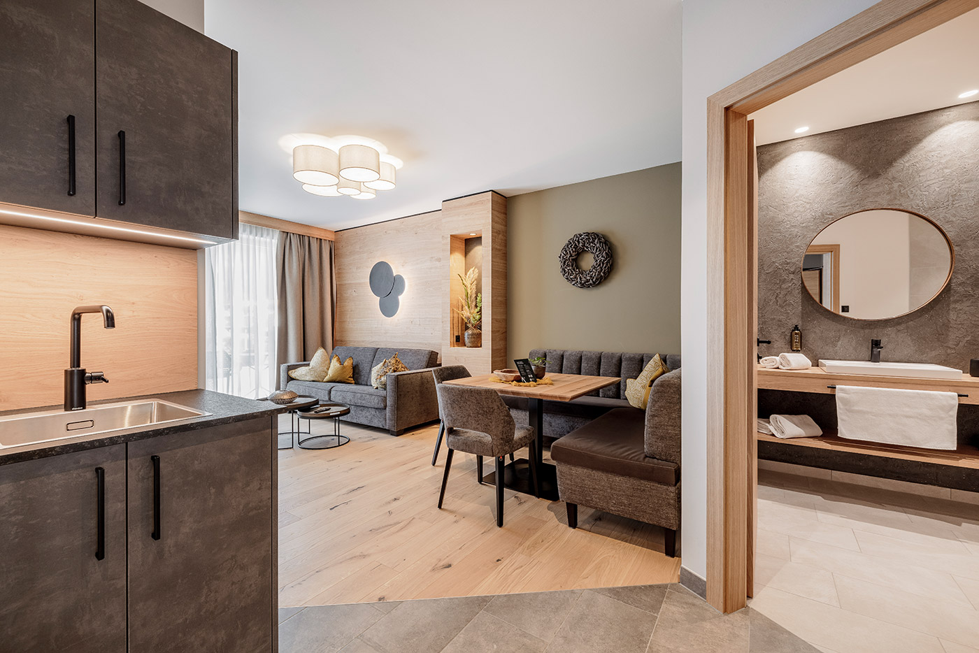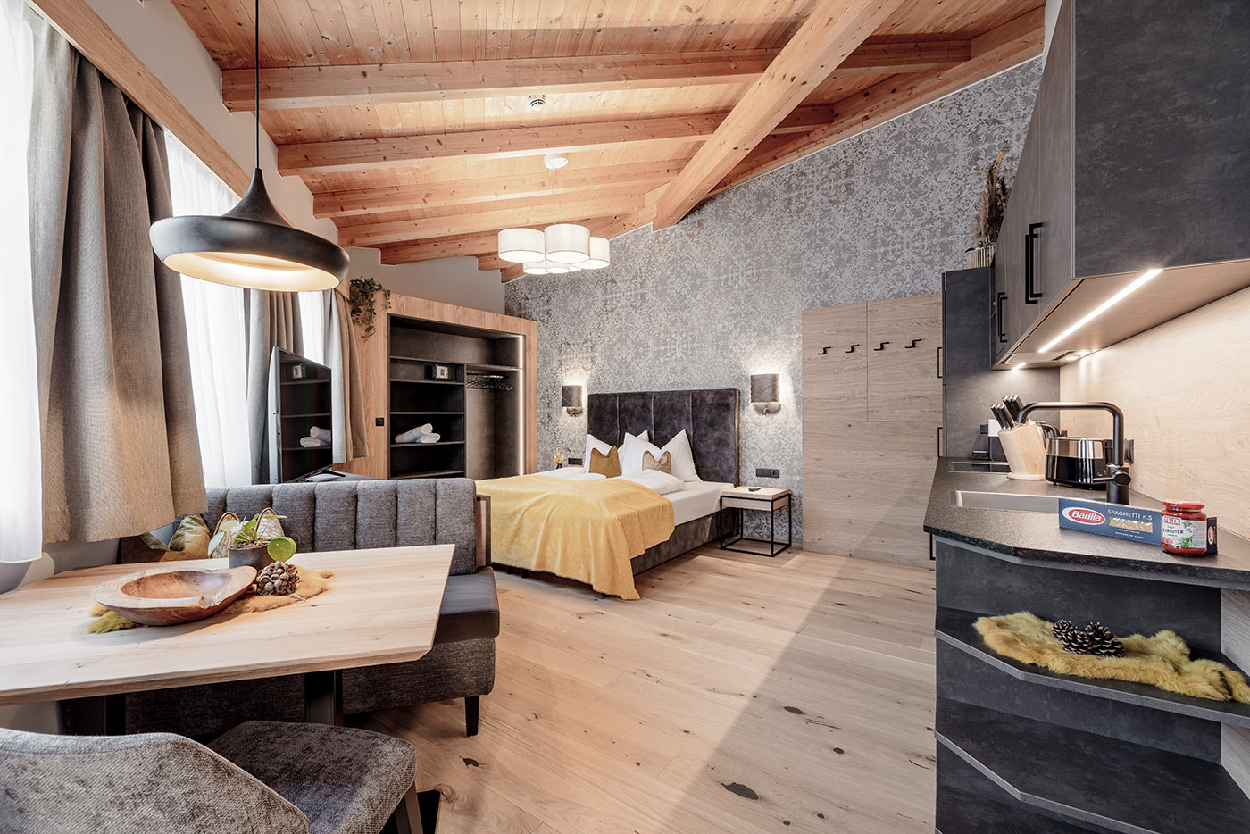 Gestalte deinen Urlaub individuell und so, wie du möchtest. Unsere Apartment-Kategorie Peaks für zwei bis vier Personen, mit einem Schlafzimmer, ist perfekt für Paare und kleine Familien, Freunde und Alpinisten, die es kaum erwarten können, die Berge zu beradeln, erwandern oder auf Tourenskiern zu erforschen. Jedes unserer Apartments wurde von uns designt und mit hochwertigsten Möbeln ausgestattet. Genieße viel Raum, Sonne und beste Aussichten auf das, was dich erwartet: Bergabenteuer der Superlative im Tal der Dreitausender.