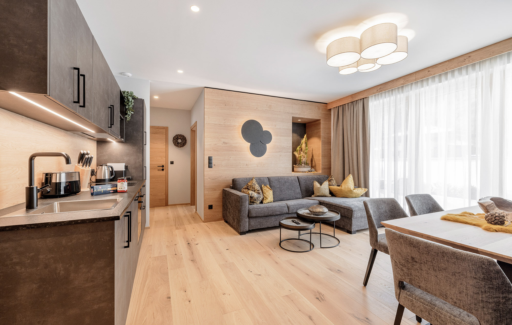 - Offener Wohnraum mit gemütlicher Couch (Schlafmöglichkeit für weitere Personen), Küche, Esstisch und Smart TV