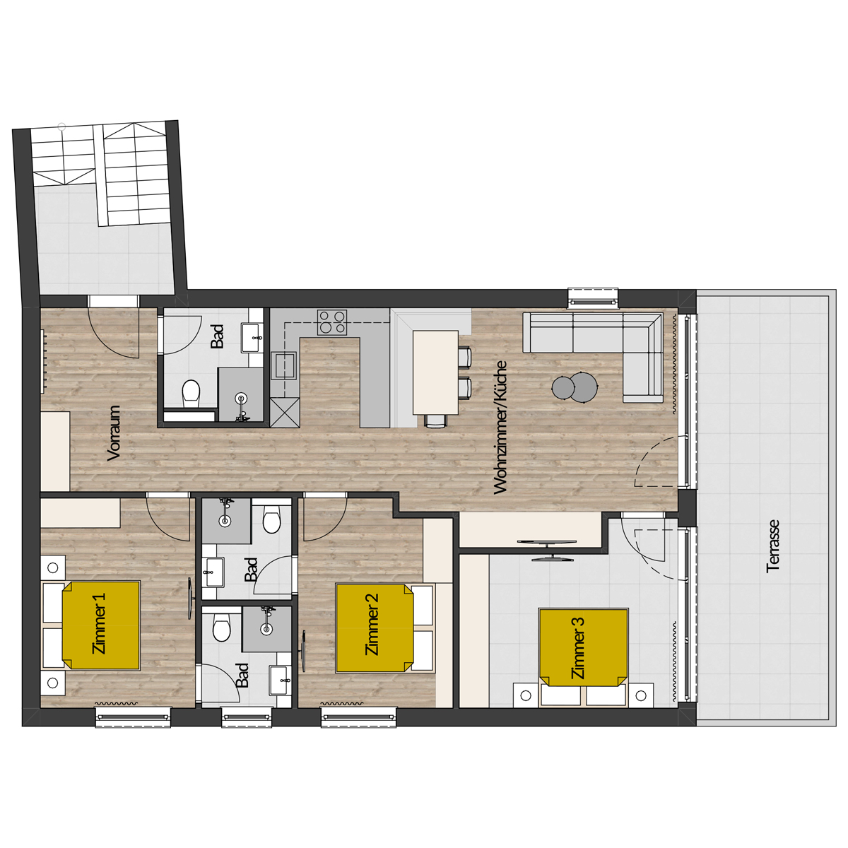 - 3 Badezimmer mit Dusche und WC