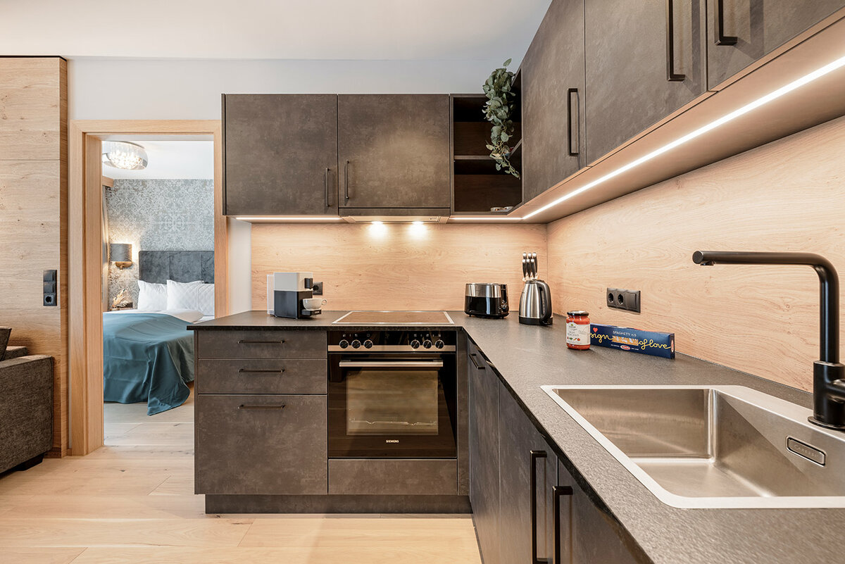 - Offener Wohnraum mit gemütlicher Couch (Schlafmöglichkeit für weitere Personen), Küche, Esstisch und Smart TV